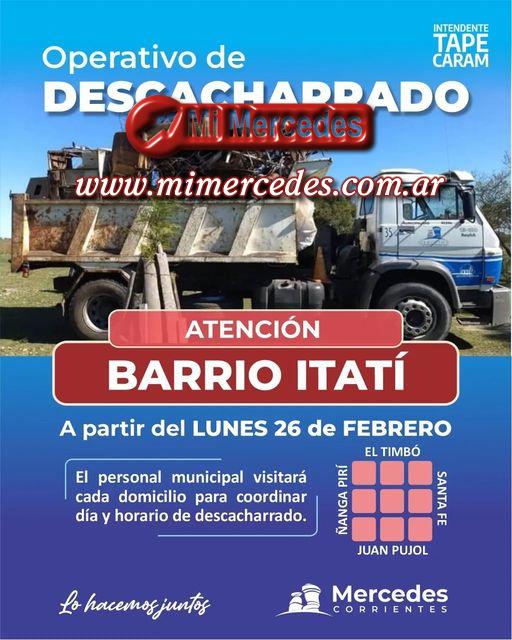 Atención señor vecino del barrio Itatí, a partir del día lunes 26 de febrero el personal municipal pasará por su domicilio (comprendidas entre las calles Santa Fe y El Timbó; y entre Ñangá Pirí y Juan Pujol) para coordinar el día y horario de descacharrado.