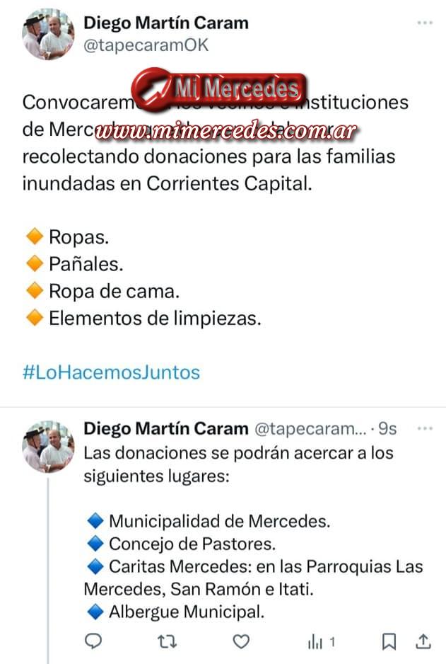 El Intendente de Mercedes, Tape Caram convocó públicamente a los vecinos, instituciones del medio y organizaciones sociales para juntar donaciones y destinarlas a las familias afectadas por las inundaciones de Corrientes Capital.