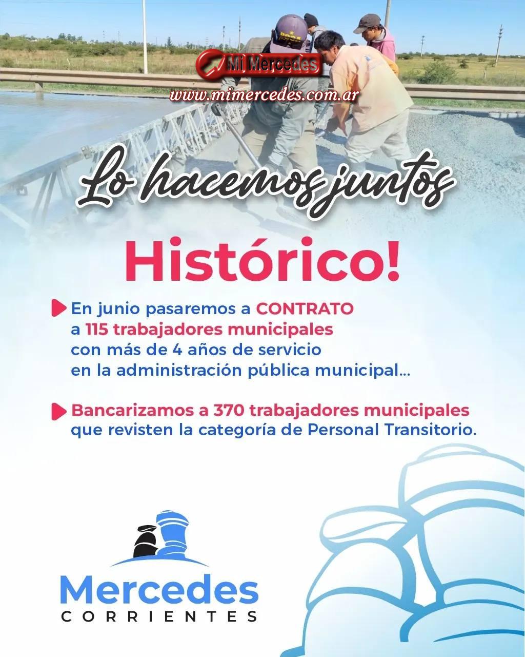 La Viceintendente a cargo del Ejecutivo Municipal, Juanita Gauto anunció que luego de haber realizado personalmente la auditoría del personal transitorio, ha tomado la decisión junto al equipo de gobierno de pasar a contrato a toda aquella persona que posea más de 4 años de servicio en la Municipalidad de Mercedes. De este modo, en el mes de junio se incorporará a 115 trabajadores municipales que pasarán a contar con un contrato de trabajo y con los beneficios que este le brinda.