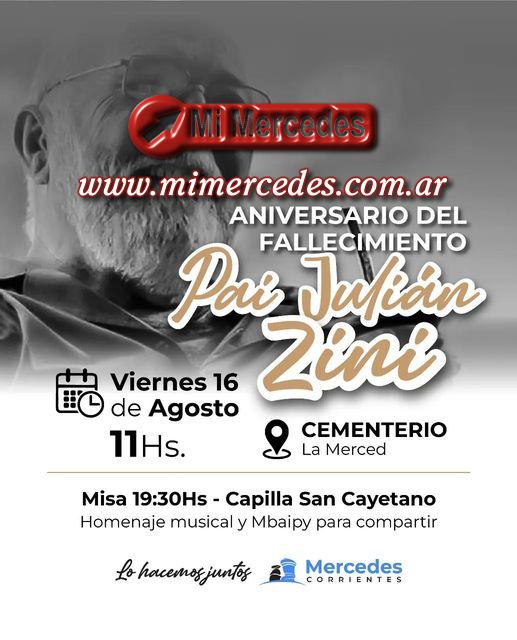 El Gobierno Municipal de Mercedes los invita al homenaje al pai, músico y autor Julián Zini, este viernes 16 de agosto