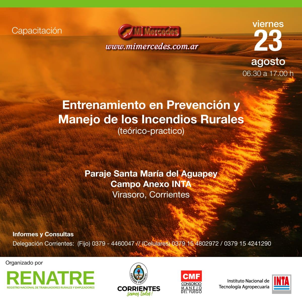 El Registro Nacional de Trabajadores Rurales y Empleadores (RENATRE) participa en la organización de la jornada de “Entrenamiento en Prevención y Manejo de los Incendios Rurales”, a realizarse este viernes 23 de agosto en Gobernador Virasoro.