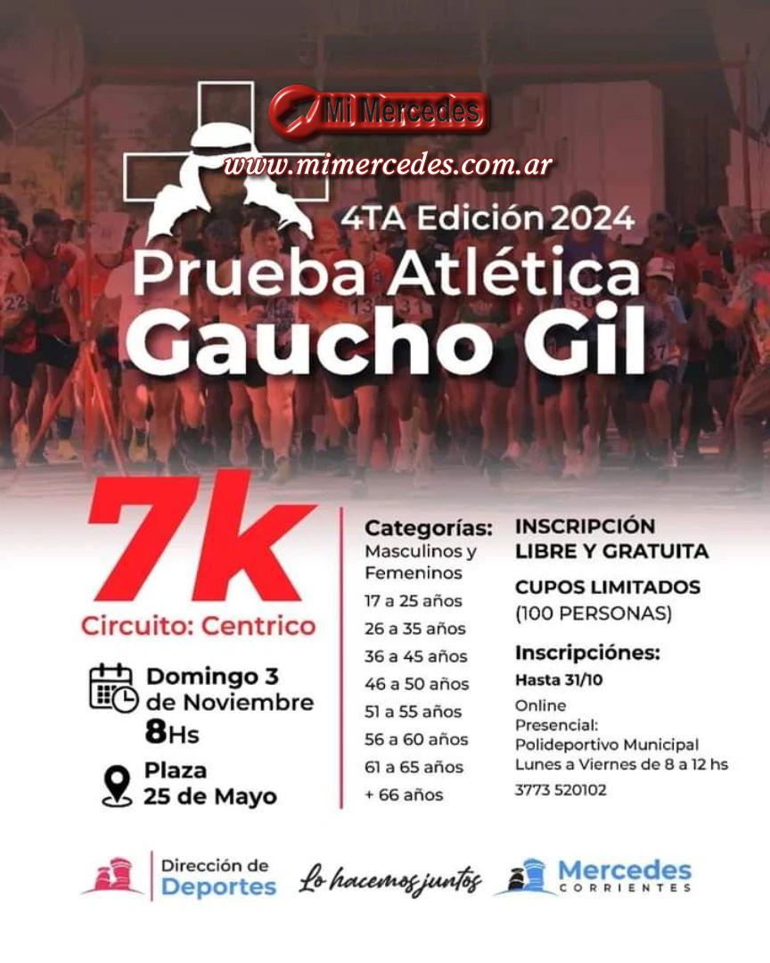 El Domingo 3 de noviembre a las 8:00 hs, la ciudad se prepara para vivir una nueva edición de la Prueba Atlética Gaucho Gil. El recorrido será un emocionante circuito céntrico de 7 kilometros, comenzando en la Plaza 25 de Mayo.