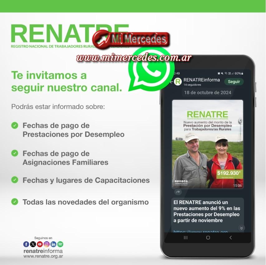 El Registro Nacional de Trabajadores Rurales y Empleadores (RENATRE) lanzó un nuevo canal oficial de WhatsApp se podrán mantener al día con todas las novedades.