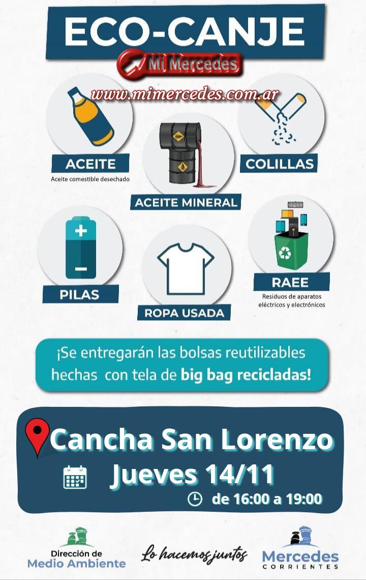 Este jueves 14 de noviembre, de 16:00 a 19:00 horas, en la cancha de San Lorenzo (Chacabuco y Marco Azcona), el Gobierno Municipal de Mercedes, a través de la Dirección de Medio Ambiente, invita a participar de una nueva jornada de Eco-Canje.