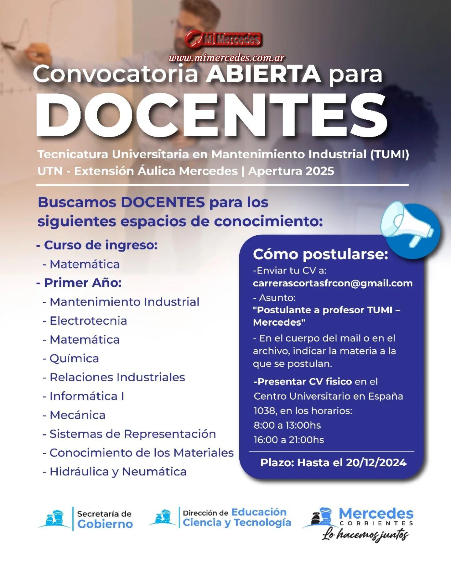 La Dirección de Educación, Ciencia y Tecnología, dependiente de la Secretaría de Gobierno abre la convocatoria para docentes que cubran cátedras correspondientes a Tecnicatura Universitaria en Mantenimiento Industrial (T.U.M.I.) de la U.T.N.