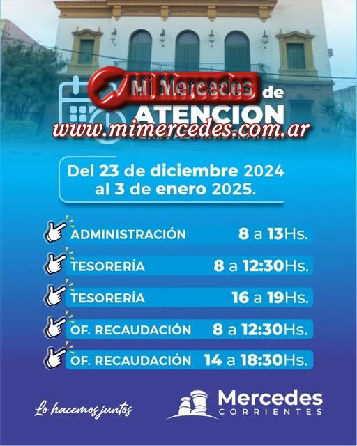 El Gobierno Municipal de Mercedes informa que los horarios de la feria administrativa desde el 23 de diciembre de 2024 hasta el 03 de enero de 2025, son: